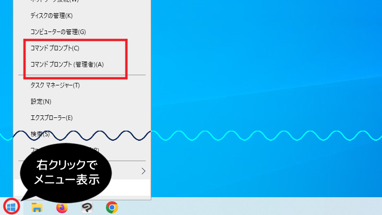 下の画像のように、Windowsのアイコンを右クリックするとメニューが表示されます。