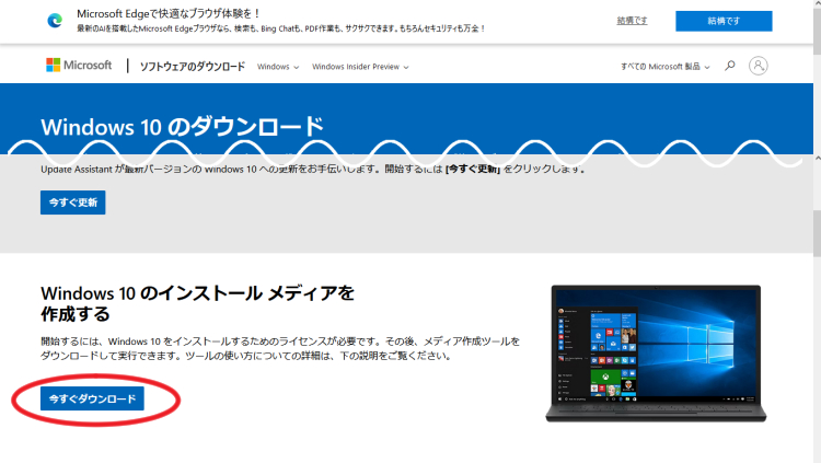 【Windows10のインストールメディアを作成する】の下にある「今すぐダウンロード」をクリックし、メディア作成ツールをダウンロードします。