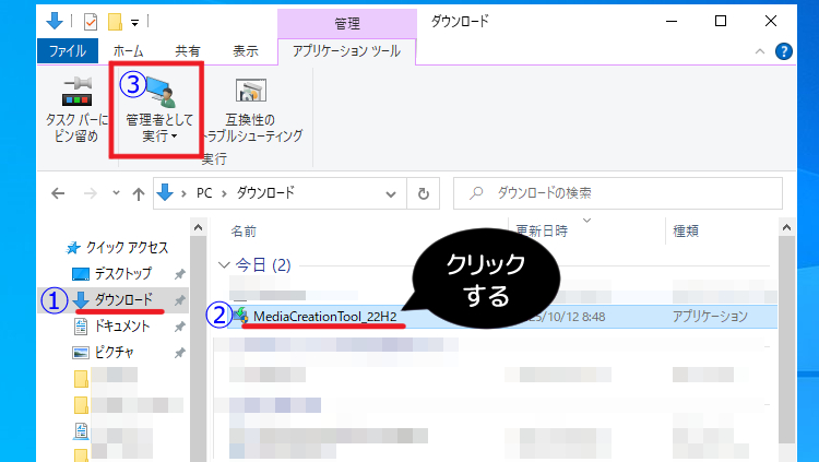 ダウンロードしたメディア作成ツールは、ダウンロードフォルダに格納されています。