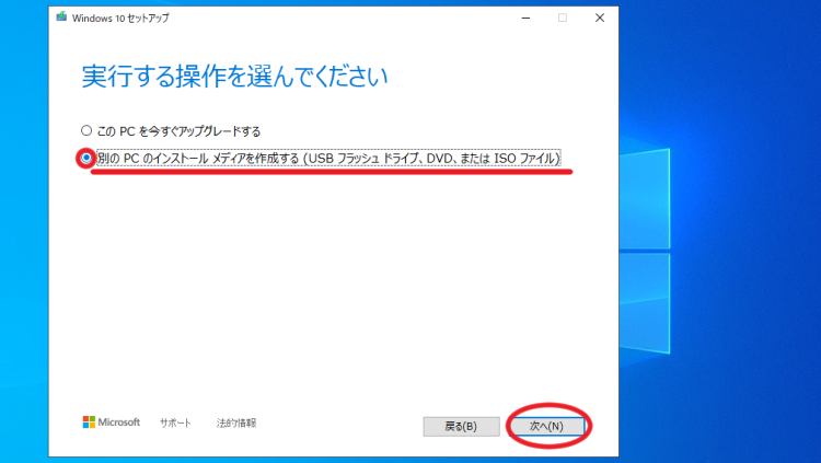 下の画像のように、【別のPCのインストールメディアを作成する〜】を選択し、「次へ」をクリックします。