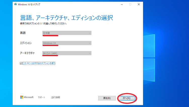 下の画像のように言語、アーキテクチャ、エディションを選択し、「次へ」をクリックします。