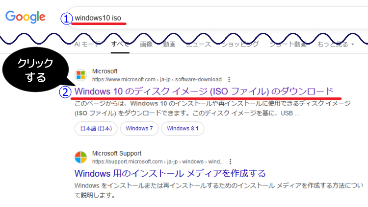 Googleなどの検索エンジンで、「Windows10 ISO」と検索します。